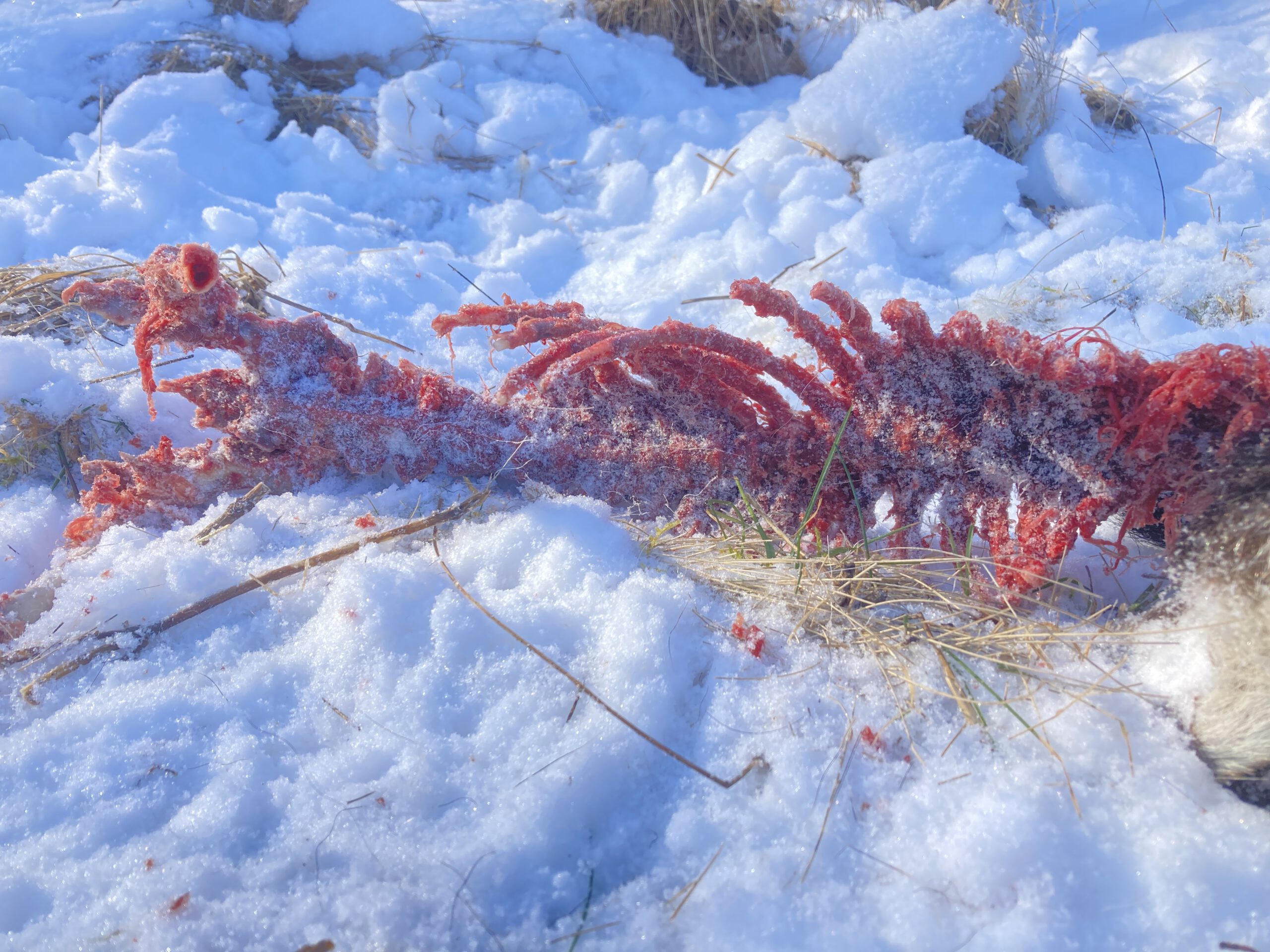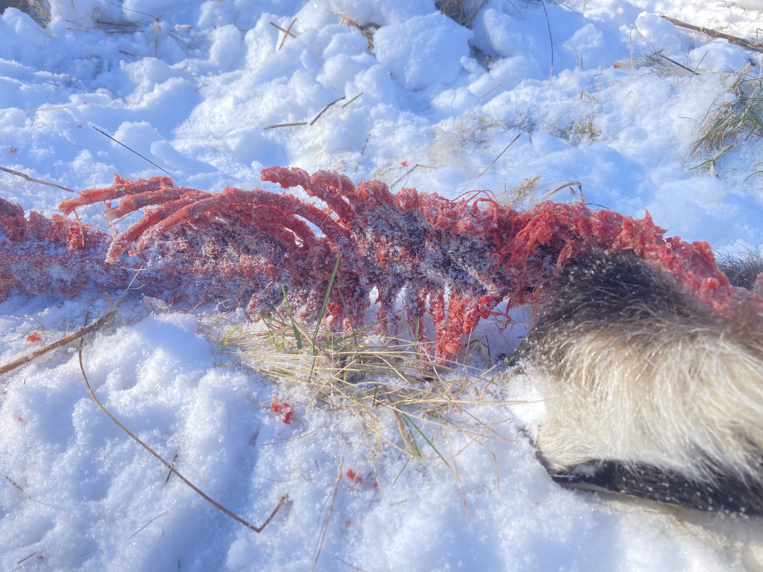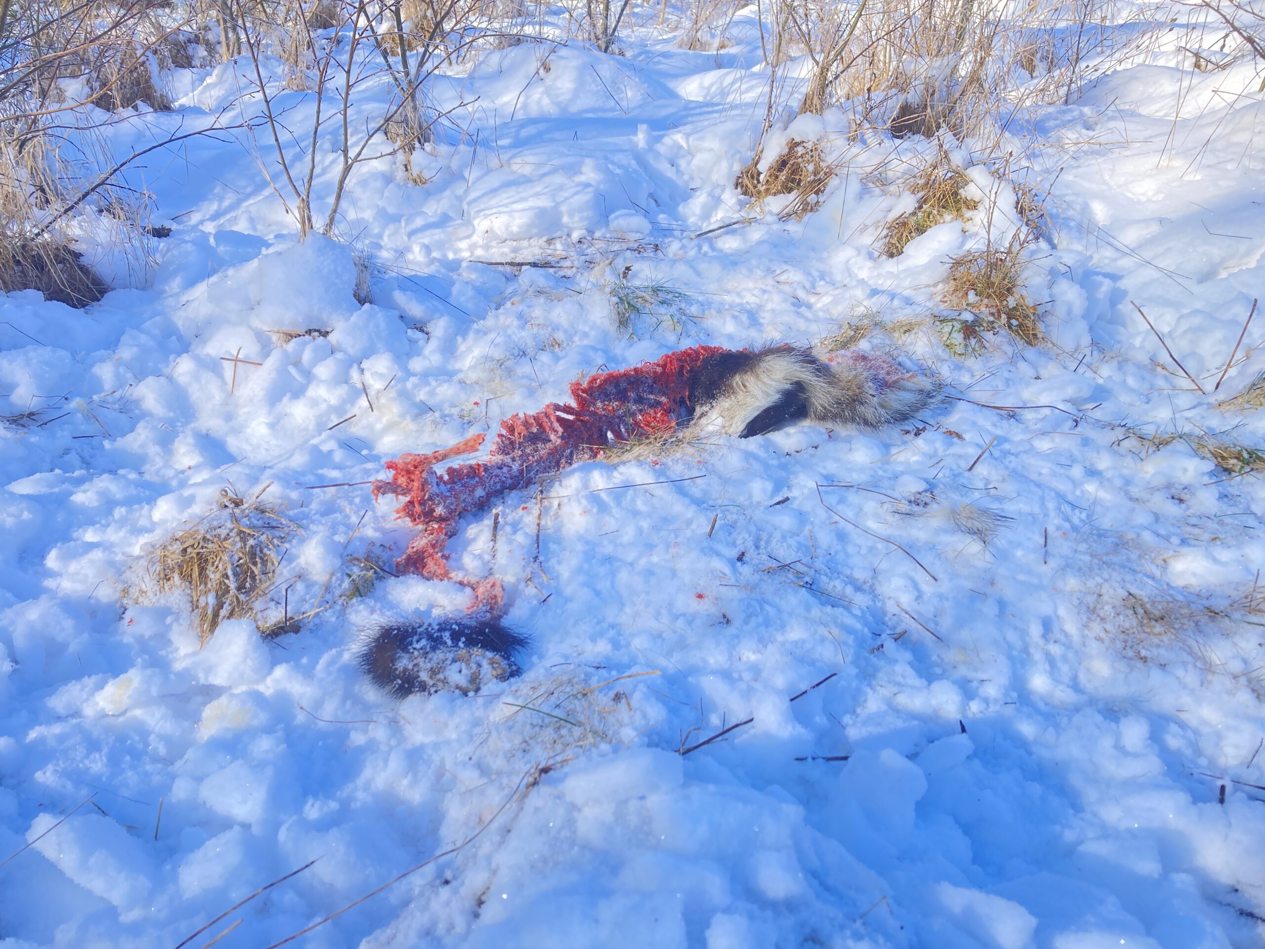 Het voorjaar hangt in de lucht. Toch is hier de afgelopen dagen nog ruim 15 centimeter sneeuw gevallen die is blijven liggen. De nachttemperaturen zijn ook nog aardig onder het vriespunt. Deze lage temperaturen zorgen er voor dat dode dieren langer beschikbaar blijven voor aaseters. Niet alleen zoogdieren als vossen, wilde zwijnen, marters en wilde katten doen daar dan hun voordeel mee. Ook veel (roof)vogels. De afgelopen week werd een doodgereden das binnen een mum van tijd verorberd door met name buizerds, raven en rode wouwen. Het kadaver ligt op het terrein van Sauvache en was eerst versleept en deels opengetrokken door een vos, waarna deze vogels zich er makkelijker tegoed aan konden doen. Nu het voorjaar op komst is, zal de das snel ook nog andere dienst doen. Als mezen en roodborstjes, maar ook eekhoorns en muizen, de haren uit de vacht komen plukken en gebruiken voor het bekleden van hun (nieuwe) nest.